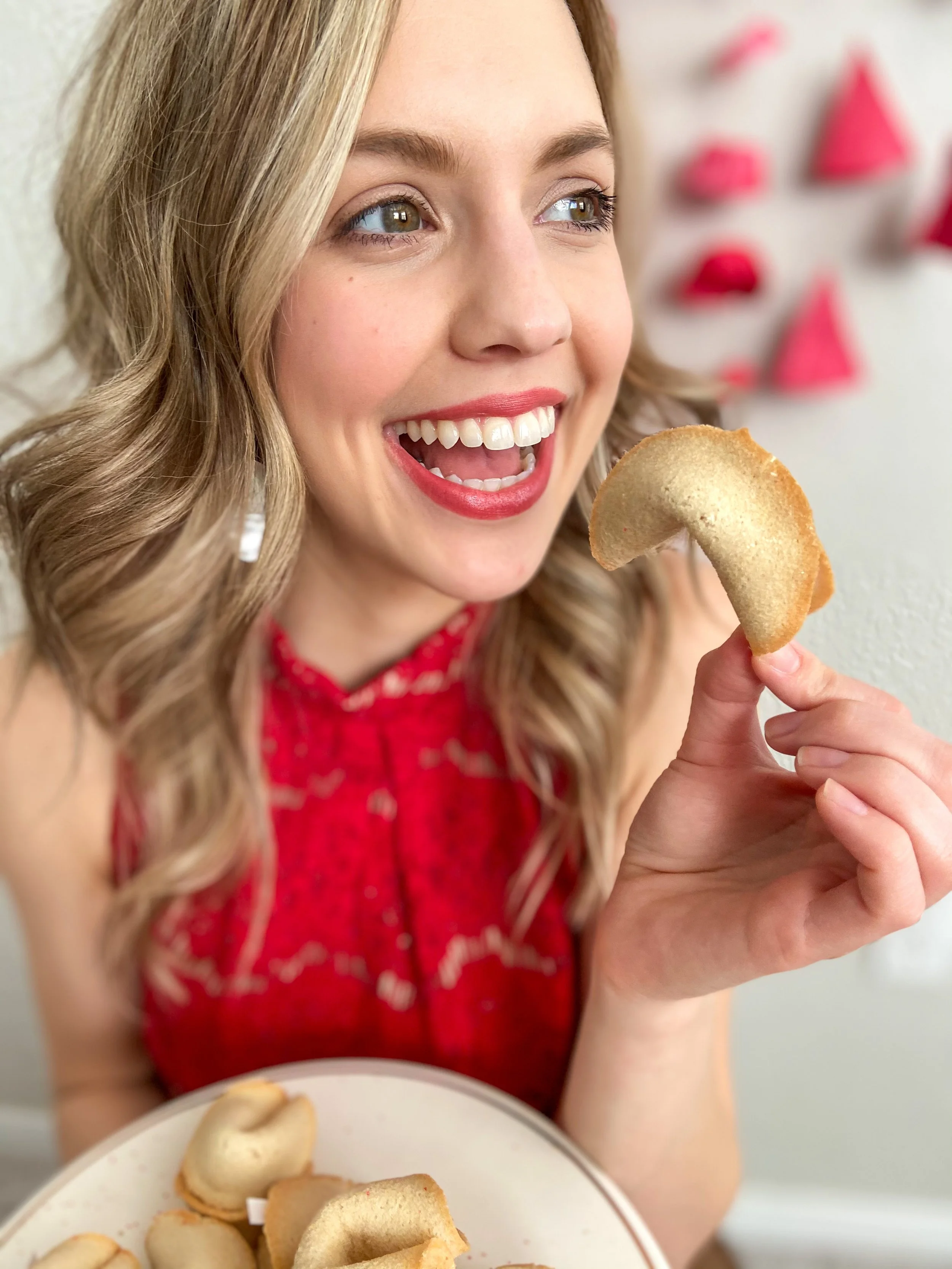 I originally planned on dipping the edges of the cookies in white chocolate then sprinkling red and gold sugar on top to add sparkle, but being homemade they weren't quite perfectly closed as pre-packaged. So what you could do is support your favorite local Chinese restaurant by purchasing fortune cookies & then fancy-fy them with chocolate and sprinkles.