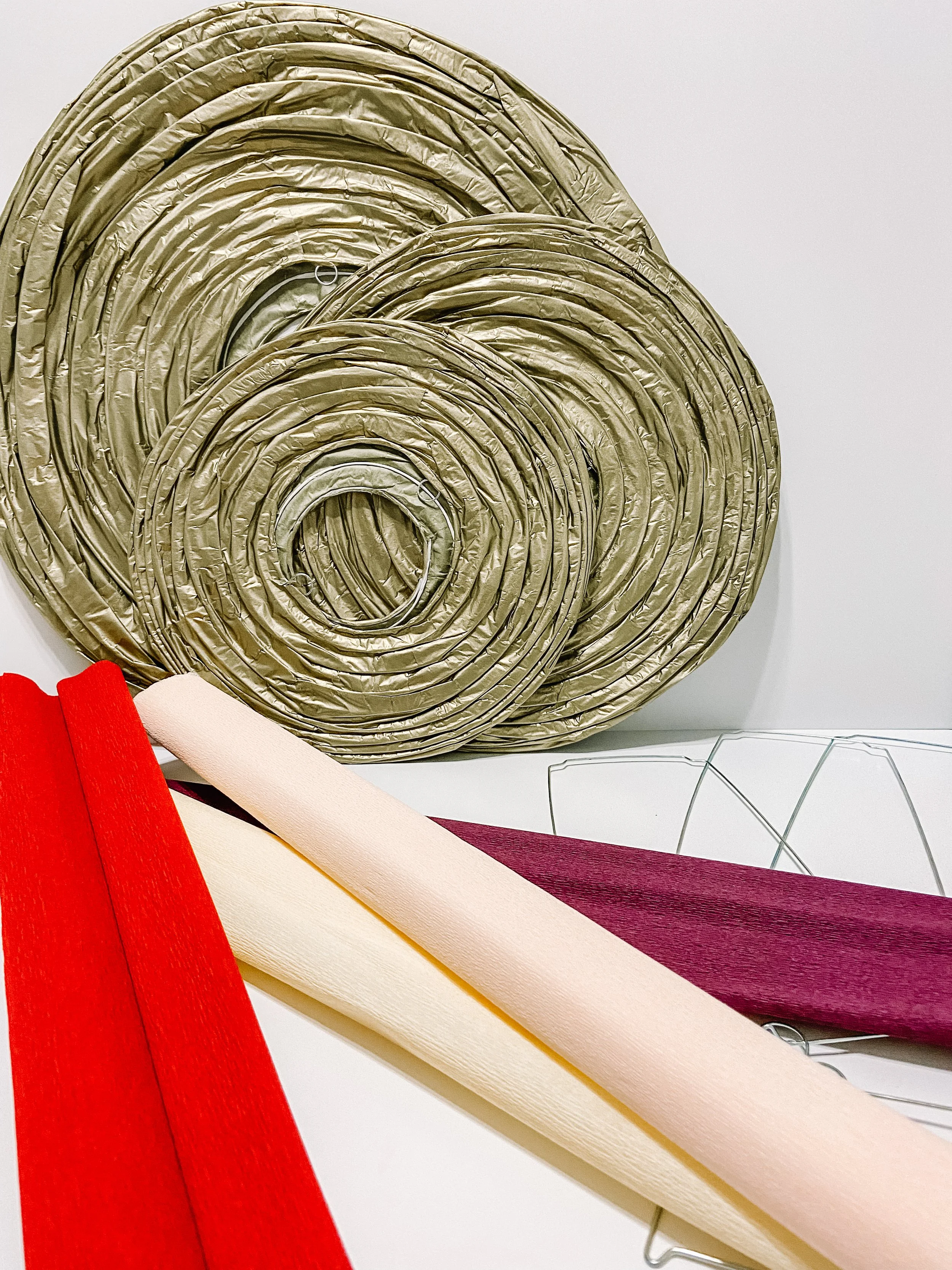 I chose a pack of three gold lanterns to embellish with fall hues of crepe paper I had at home. I fashioned fringe, tassels, & stripes with the malleable material and hot glued to secure.