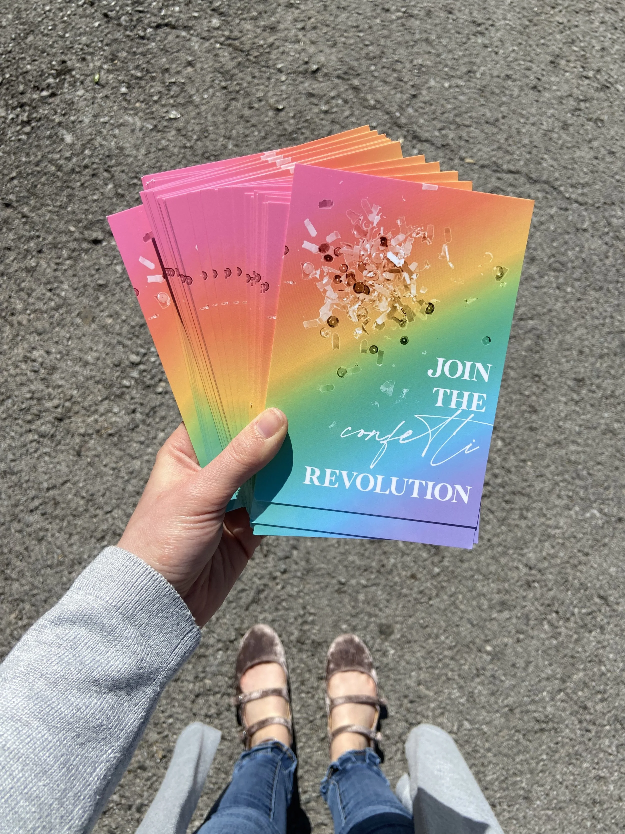 Of course Jessica, Confetti Queen of The Confetti Bar, was down for a celebration & boy, did she bring the party! She designed rainbow confetti revolution cards to spread the word about this fantastically made up holiday. It's occurred to me that I really like leaving happy things in random places for people to stumble (& hopefully smile) upon. With these cards I did just that in the weeks leading up to March 31st. I know it worked because a co-worker spotted one of my planted cards out & about haha! It's my hope that the rest of my card soldiers completed their mission of spreading joy just like this one. There was no shortage of other colorful products in a fabulous TCB drop to keep the party going; including celebration kits. (Limited quantities still available here. 😉 There's even a FREE digital kit that's downloadable!)